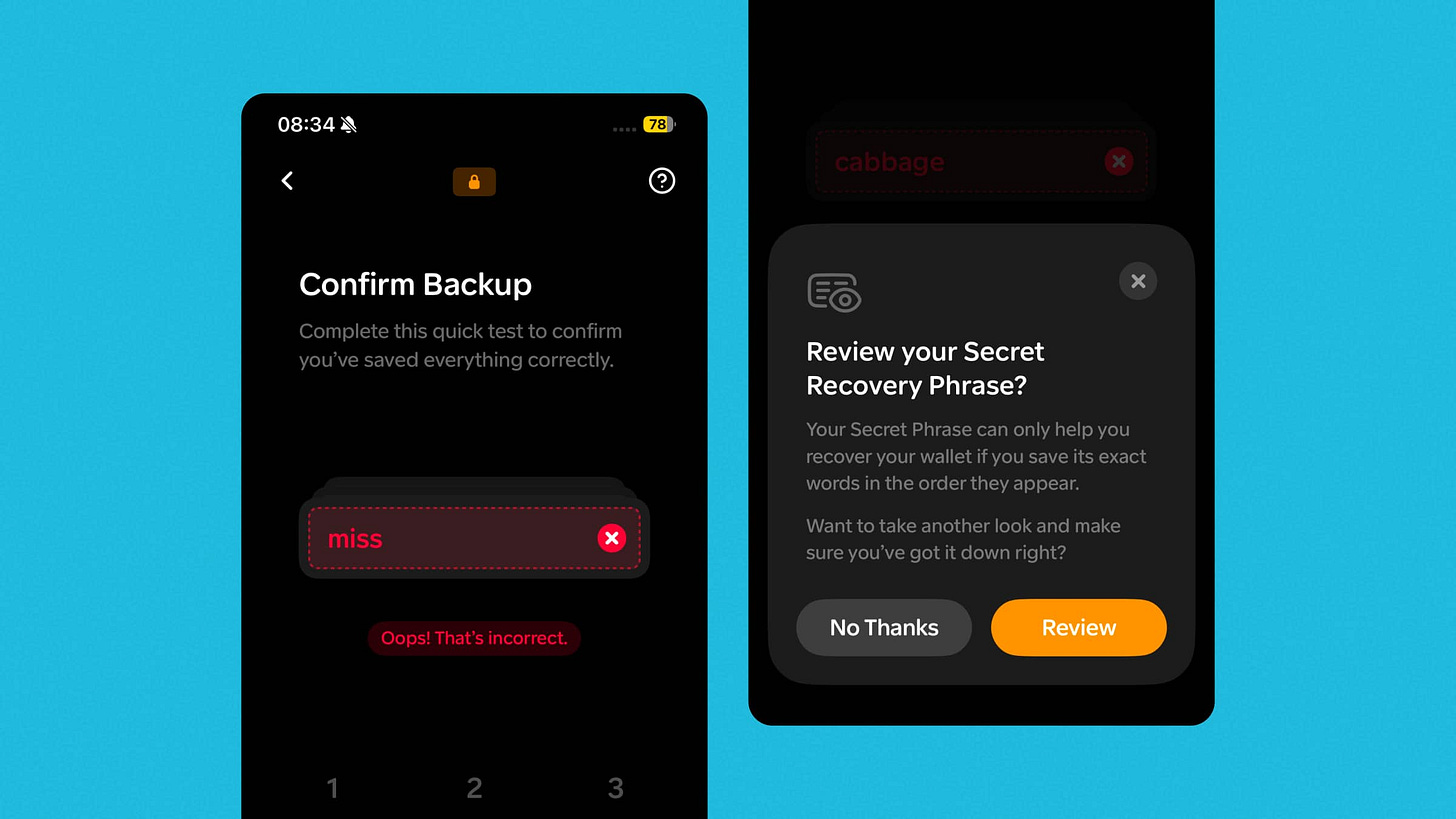 After showing you your seed phrase, Family asks you to confirm the order of 4 random words. Get one wrong twice in a row, and a friendly bottom sheet slides up offering to let you review the phrase again.