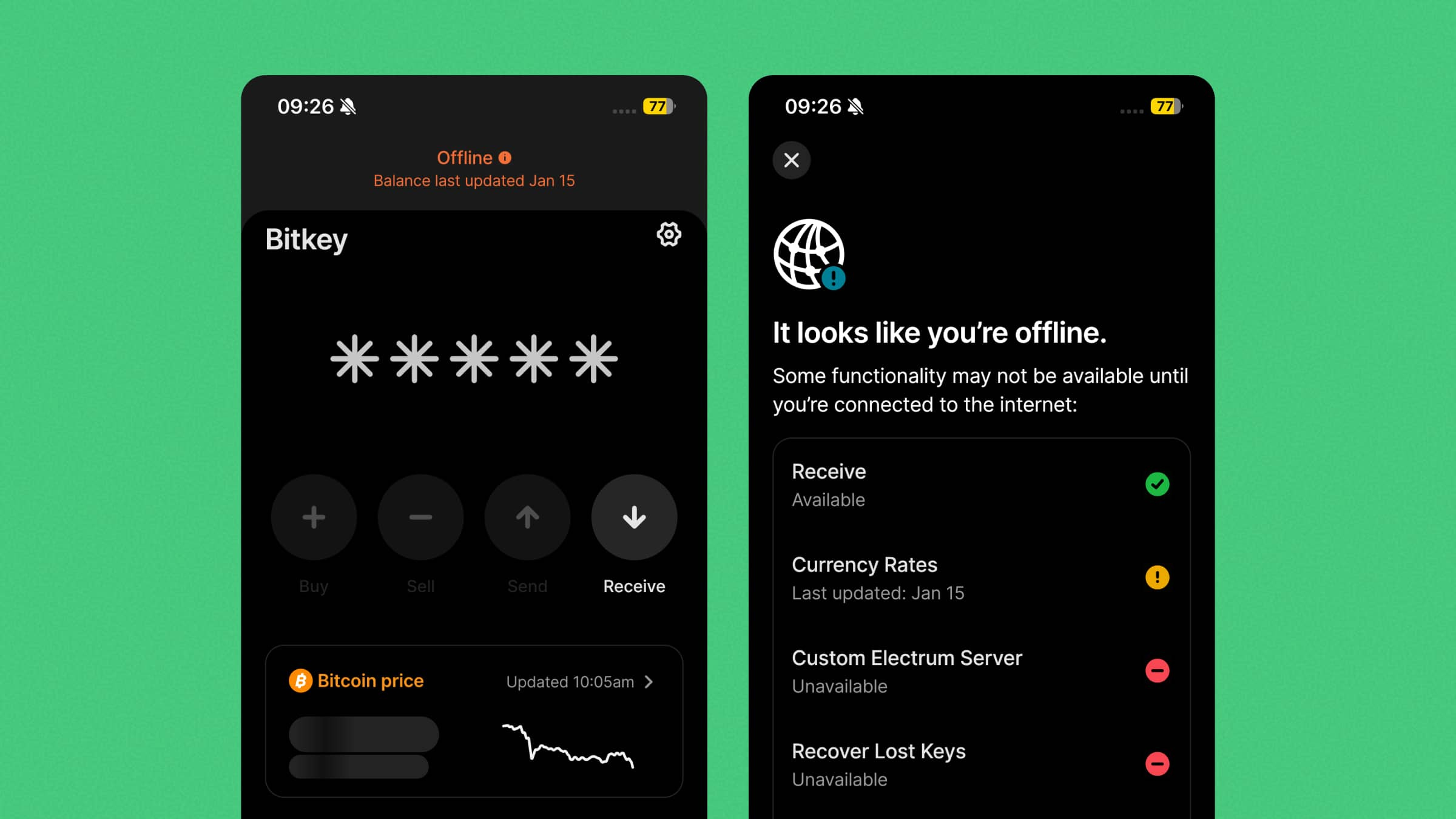 Most apps treat offline as a binary: you’re either connected or you’re not. Bitkey breaks it down. You can still receive bitcoin, your currency rates are just a day old, but sending is off the table.
