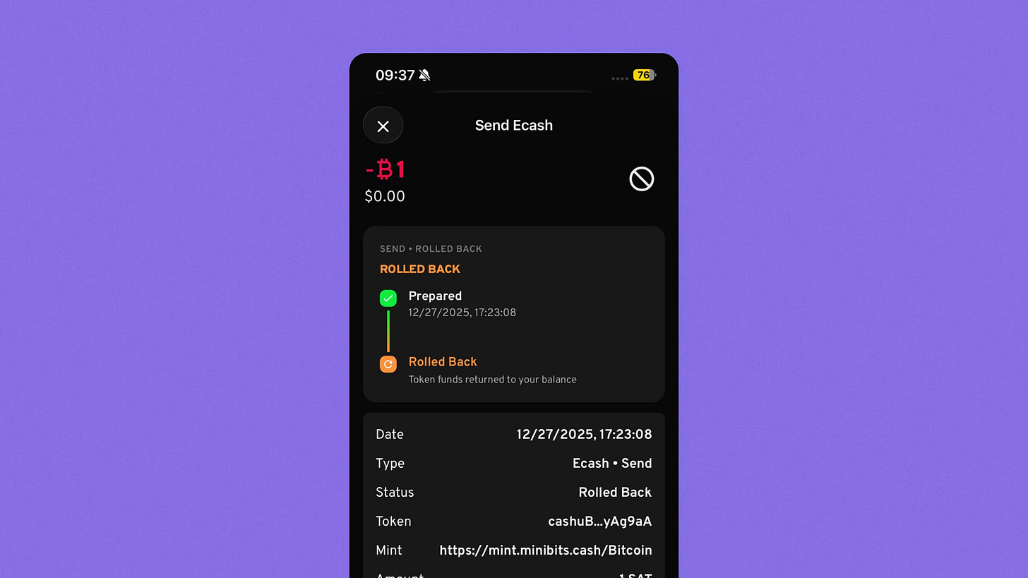 Ecash introduces UX challenges you won’t find on-chain or in lightning. When you generate a token that never gets claimed, you can redeem it yourself, but the mint has no concept of “yours” or “theirs.” Sovran names this action “Rolled Back.”