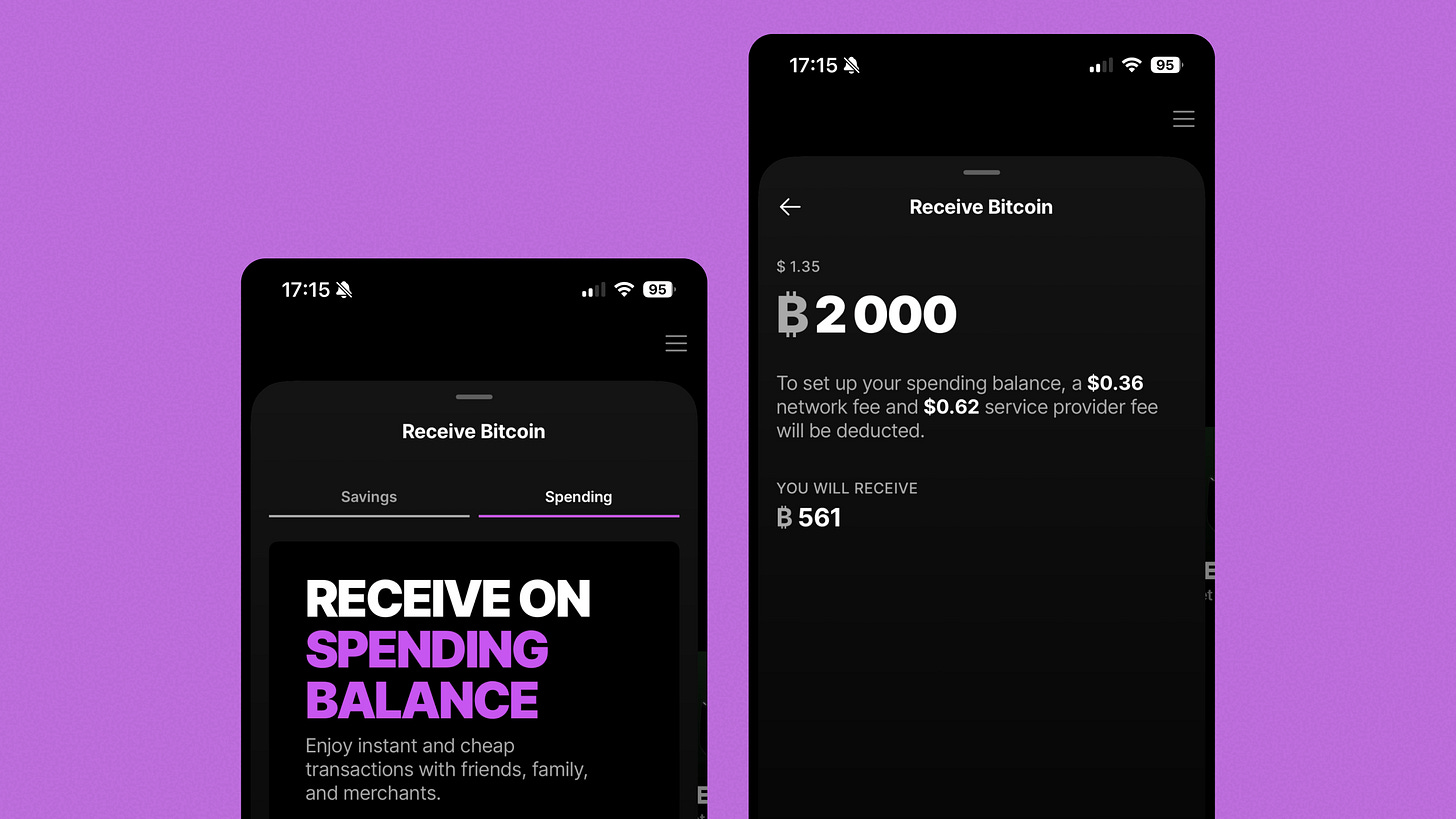 Bitkit splits your balance into “Savings” and “Spending” instead of on-chain and Lightning. When you move funds to your spending balance for the first time, they don’t explain channel liquidity or inbound capacity. They just show two fees, do the math, and tell you what you’ll actually receive.