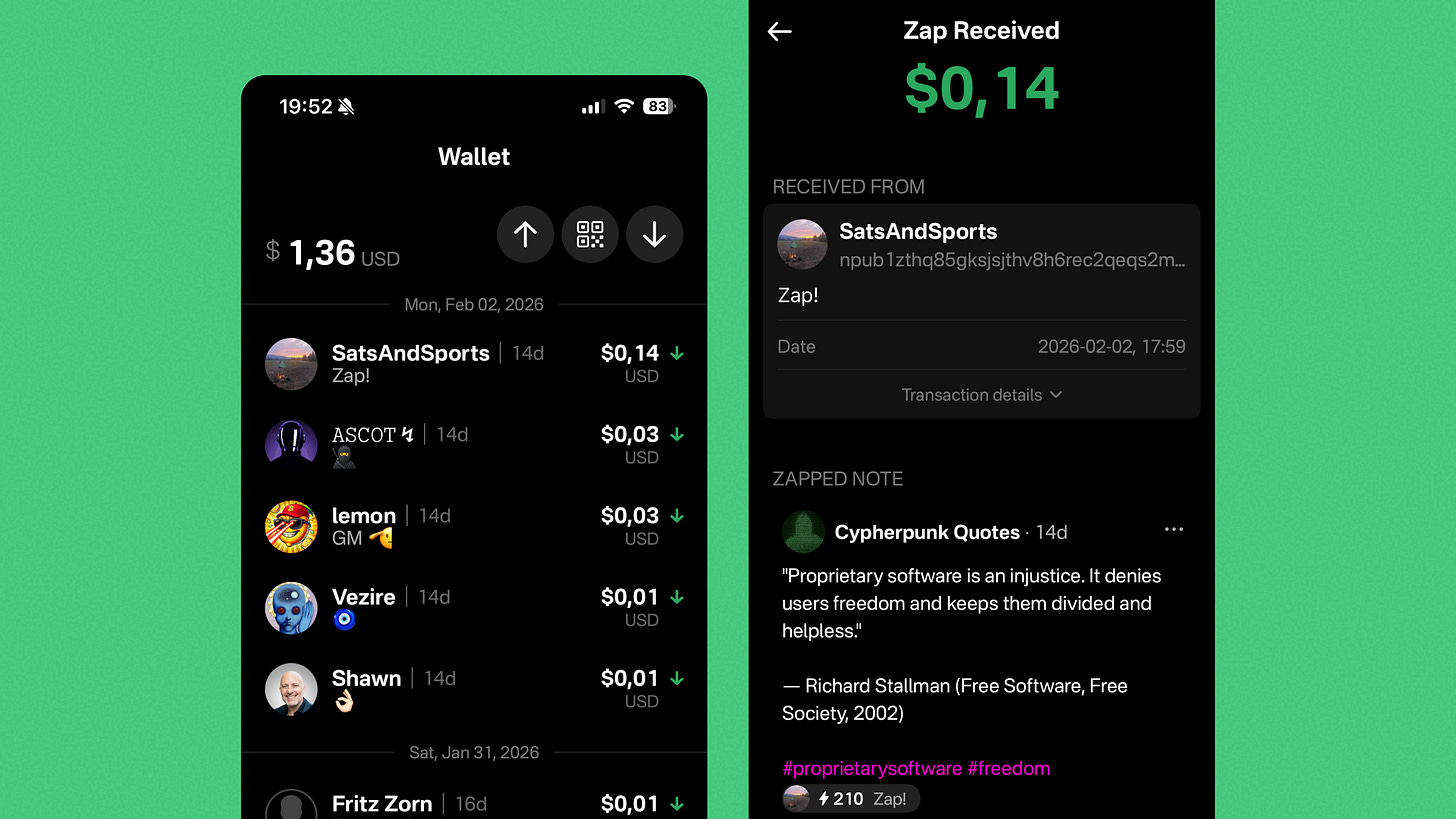 When every transaction is a micropayment, your history becomes noise fast. Most wallets would just list the amounts, maybe add a timestamp, some fee details and call it done. In the zaps case, the useful information isn’t the metadata, it’s the content the zap relates to. Primal knows this and they put the post right there in your transaction details.