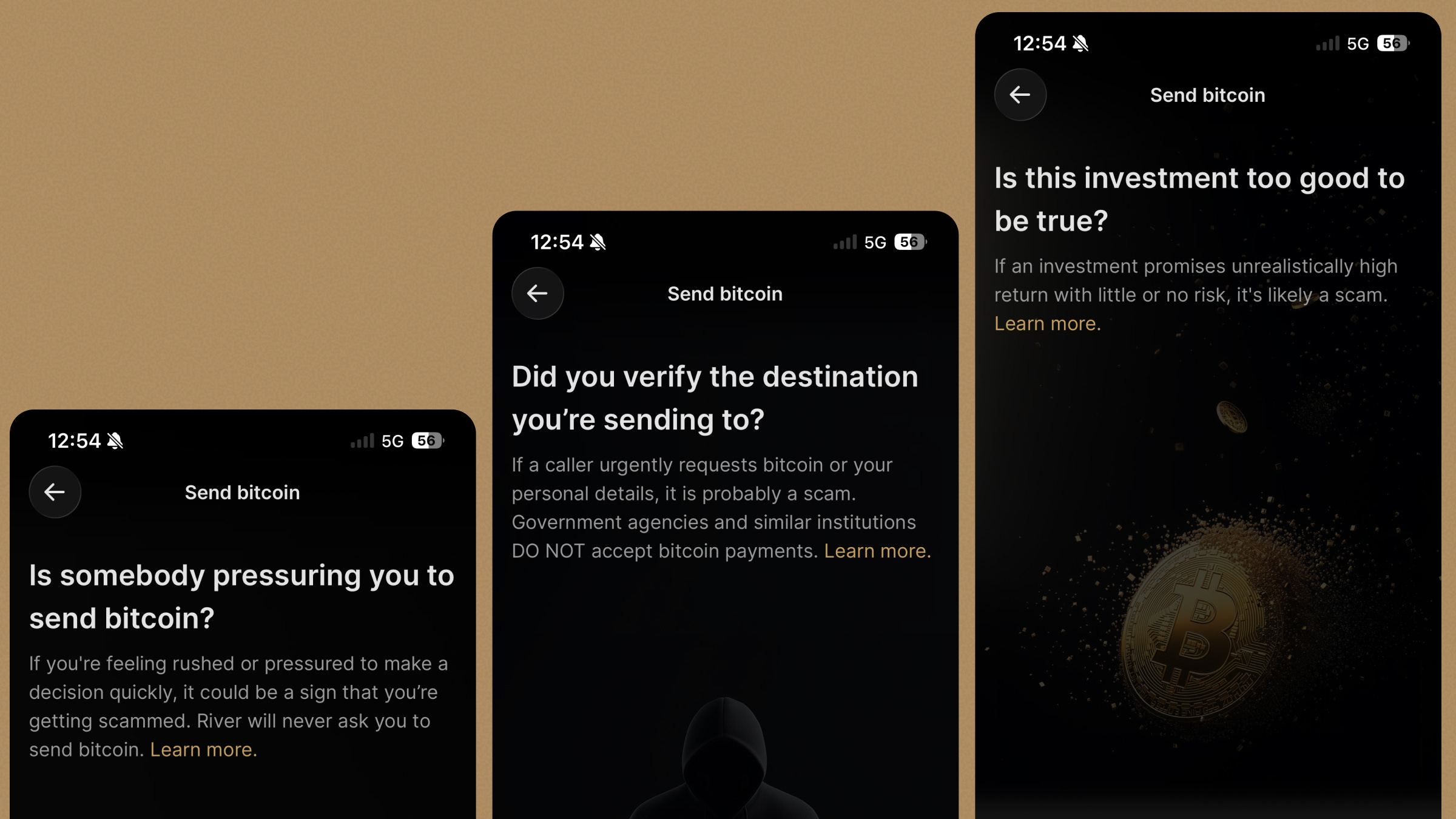 River shows a sequence of three warnings when you send a large amount of bitcoin. Each one targets a different scam vector: pressure tactics, destination verification, and too-good-to-be-true offers.