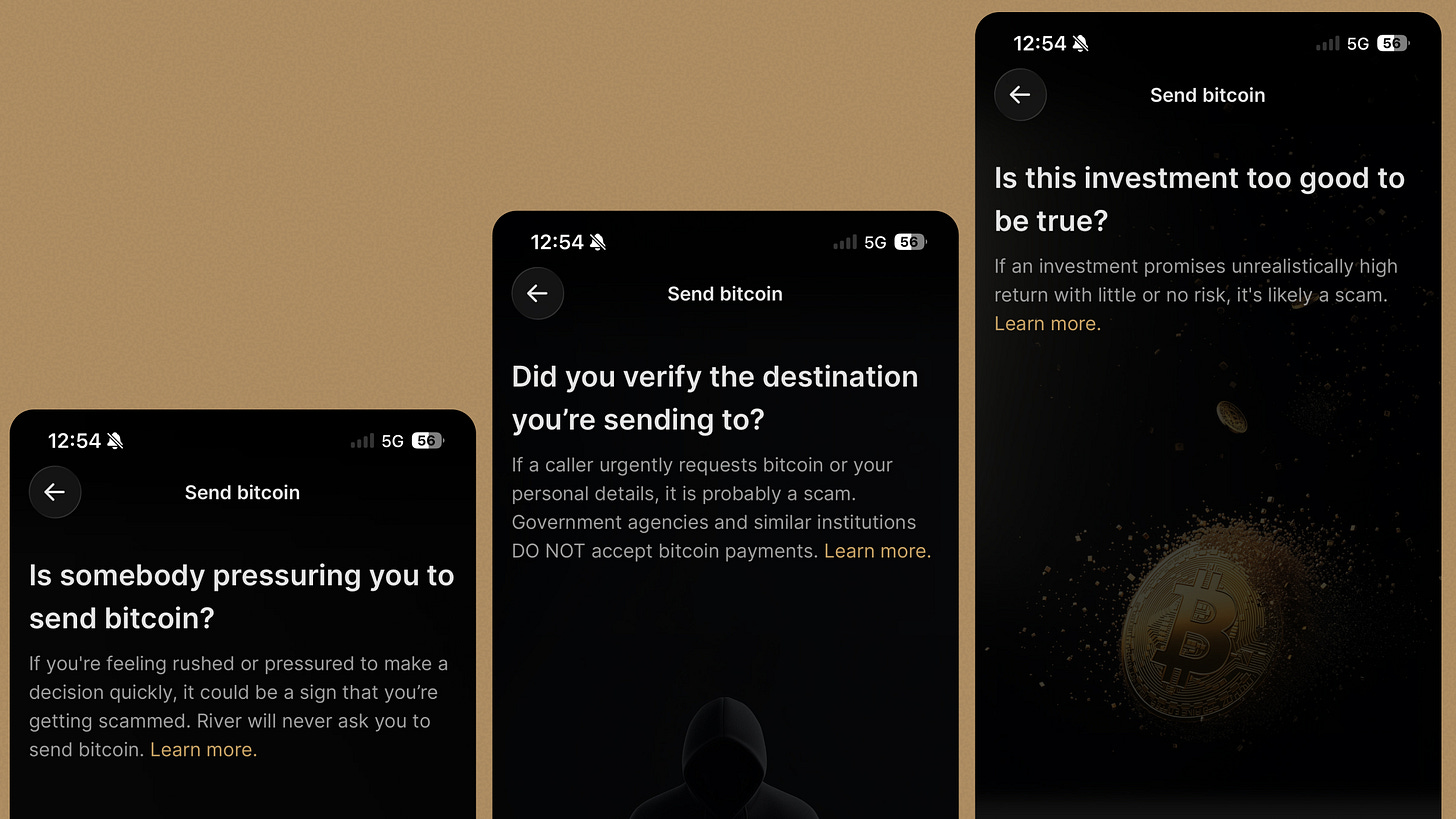 Scams exploit different psychological triggers. Urgency, greed, and confusion to name a few. River doesn’t try to catch them all with one generic warning. They slow you down three times, each targeting a specific threat pattern. Yes, it adds taps. Yes, it breaks the “don’t make me think” rule. But bitcoin is irreversible, so making you think is the feature not the bug.